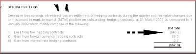 From the company earnings notes.- The Group recorded an operating loss for the quarter of RM137.9 million from a profit of RM66.3 million mainly due to a lower operating revenue in line with declining trend in global travel and cargo movements resulting from the current economic downturn. The Group recorded a loss after tax for the quarter of RM694.8 million from a profit of RM46.6 million after including derivative loss of RM557.0 million with the early adoption of FRS 139.